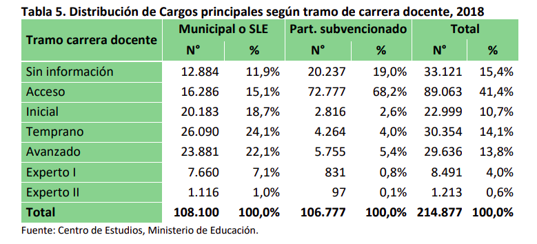 En primer lugar, no se menciona nada sobre que las/los docentes comienzan en un inventado tramo de acceso (no en Tramo Inicial), como indica la tabla. Este Tramo de Acceso es una letra chica que contiene la ley de Carrera Docente y que permite bajar los salarios. Según se aprecia en la tabla de la Minuta nº 2, Análisis Base de Datos de Cargos docentes 2018, el 41,4% está en tramo acceso y muy pocos en los otros tramos en el año 2018. Por tanto, una minoría de docentes está cobrando actualmente los salarios teóricos calculados por el CPEIP.